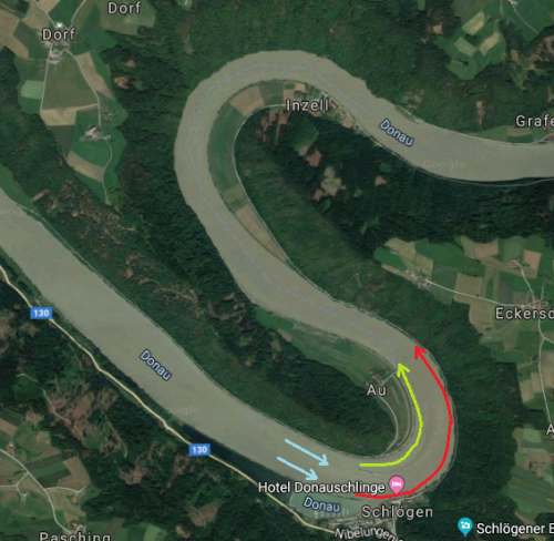 Kurve in strömenden Gewässern: die Strömung an der Kuvenaußenseite (rot) ist deutlich größer als an der Kurveninnenseite (grün), da das Wasser einen viel längeren Weg zurücklegen muss. Hier: Schlägener Schlinge. Quelle: Google, Bilder © 2020 GeoBasis-DE/BKG, GeoContent, Geoimage Austria, Maxar Technologies, Kartendaten 50m