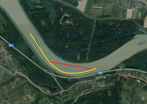 Beim Stromabfahren ist es nicht ratsam, die Kurve zu schneiden (rot), auch wenn der Weg kürzer ist. In der Innenkurve wird es aufgrund von Ablagerungen oft sehr seicht, es besteht die Gefahr, aufzufahren. Quelle: Google, Bilder © 2020 GeoBasis-DE/BKG, GeoContent, Geoimage Austria, Maxar Technologies, Kartendaten 50m