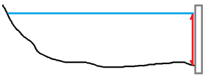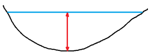 Querschnitt durch ein Gewässer - die Strömung ist im Bereich der tiefsten Stelle am größten (roter Pfeil), weil der Bodengrund die Wassergeschwindigkeit in Bodennähe am meisten verringert.Dies ist üblicherweise in der Mitte des Flusses, einseitige Ufermauern können die Lage der tiefsten Stelle jedoch verändern.