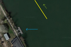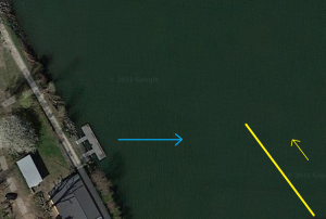 Sog und Wellen eines vorbeifahrenden Schiffes (gelb). Steht man z.B. am Floß eines Stromrudervereins, wird das Floß bei der Annäherung des Schiffes weggezogen (links), bei der Weiterfahrt entstehen Wellen (rechts).