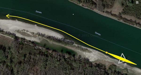 Stromaufwärtsrudern in Ufernähe. Bilder @ 2021 GeoContent, Geoimage Austria,Maxar Technologies,Kartendaten @ 2021