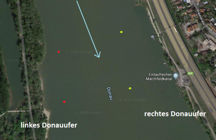 Linkes und rechtes Donauufer mit (fiktiven) Bojen