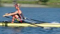 Auslageposition (links), vollständiger Einsatz des Blattes im Wasser (rechts). Beim Einsatz ändert sich der Winkel des Oberkörpers so gut wie nicht: Die Beine strecken sich geringfügig, und beschleunigen damit bereits das Blatt bevor es im Wasser versenkt wird, das Blatt „schlägt“ bereits mit Geschwindigkeit ins Wasser, das Ruder verliert dabei kaum an Arbeitswinkel.