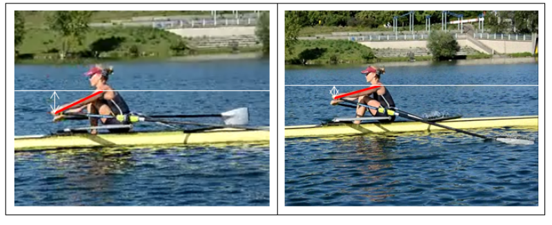 Viele Ruderer/innen haben bei voller Schlaglänge einen zu kurzen Wasserweg, weil der Innenhebel nach unten gedrückt wird, das Handgelenk nach unten geht („aufreiben“).