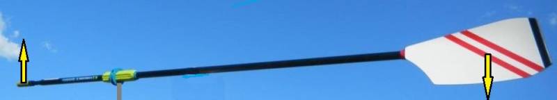 Wenn das Blatt von oben nach unten ins Wasser soll, muss sich gleichzeitig der Griff des Ruders von unten nach oben bewegen. Die Bewegungsrichtung dreht sich um, weil das Ruder in der Dolle aufliegt.